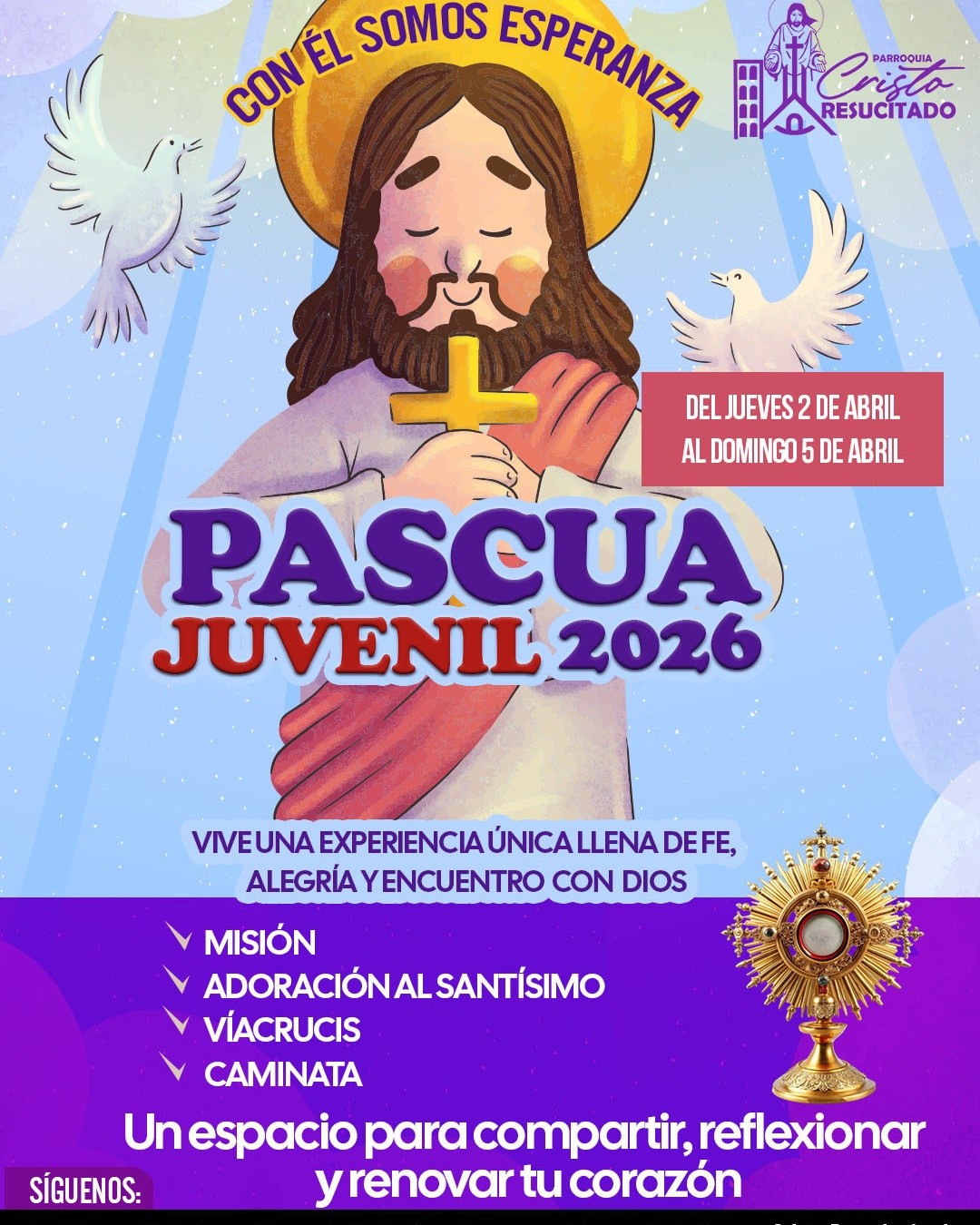 La Parroquia Cristo resucitado extiende la invitación a todos los jovenes a vivir la Pascua de una manera diferente.